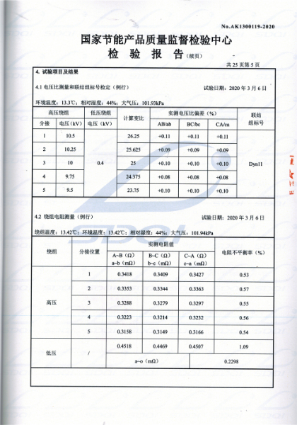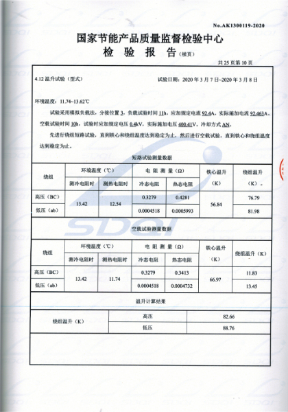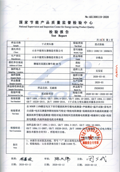國家節(jié)能產(chǎn)品質(zhì)量監(jiān)督檢驗中心 查詢編號:AK1300119 查詢備案證書號:GJJN-B-K2000120 批準(zhǔn)日前:2020-03-12 公司名稱:山東中能變壓器制造有限公司