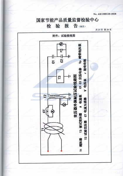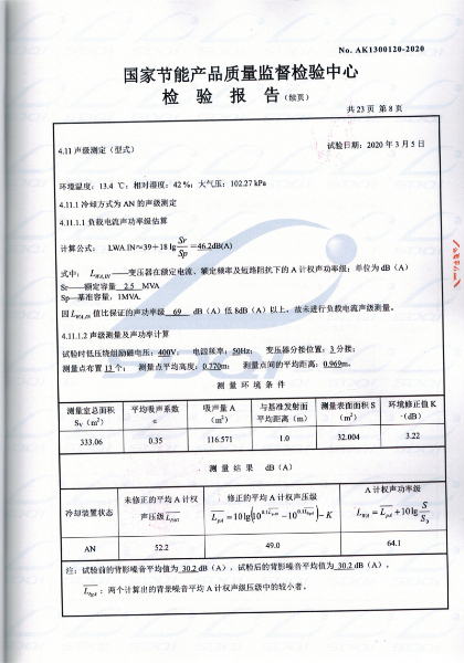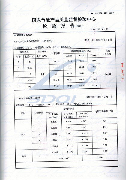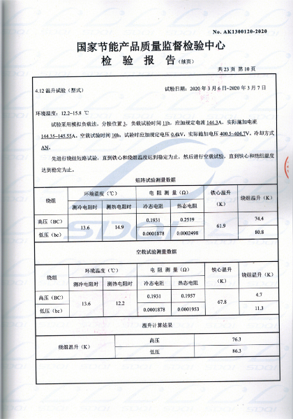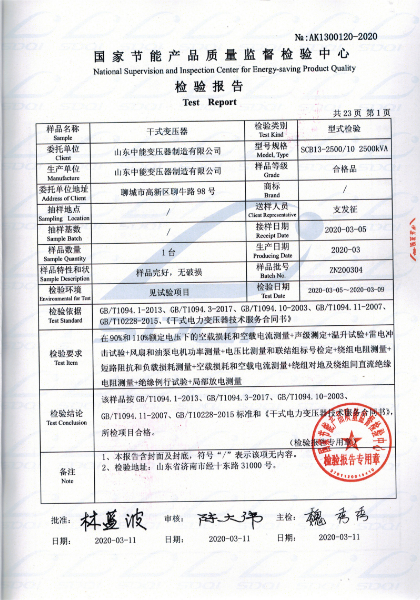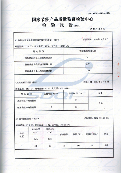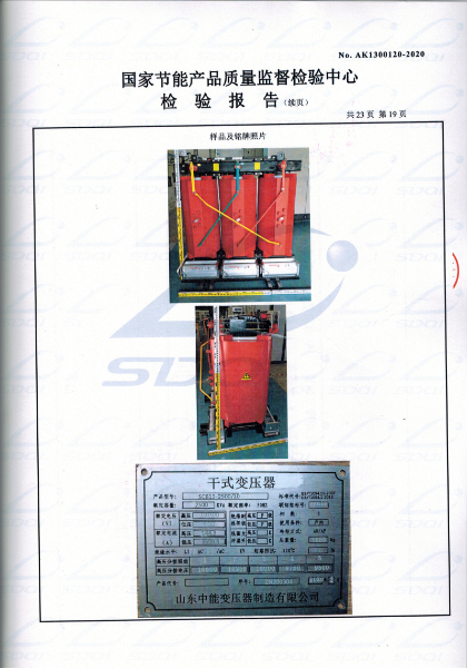 國家節(jié)能產(chǎn)品質量監(jiān)督檢驗中心 查詢編號:AK1300120 查詢備案證書號:GJJN-B-K2000120 批準日前:2020-03-11 公司名稱:山東中能變壓器制造有限公司